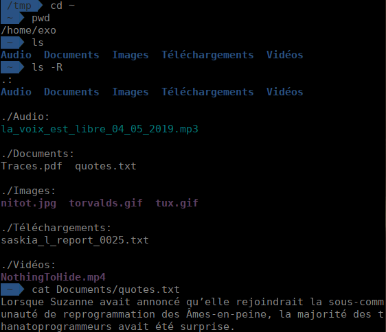 Essayez les mêmes commandes sur un shell local et observez les différences. Les dossiers sont sans doute différents. Le fichier quotes.txt n'existe pas sur votre ordinateur, vous ne pouvez pas l'afficher. Aussi, le nom de votre répertoire courant sera différent.