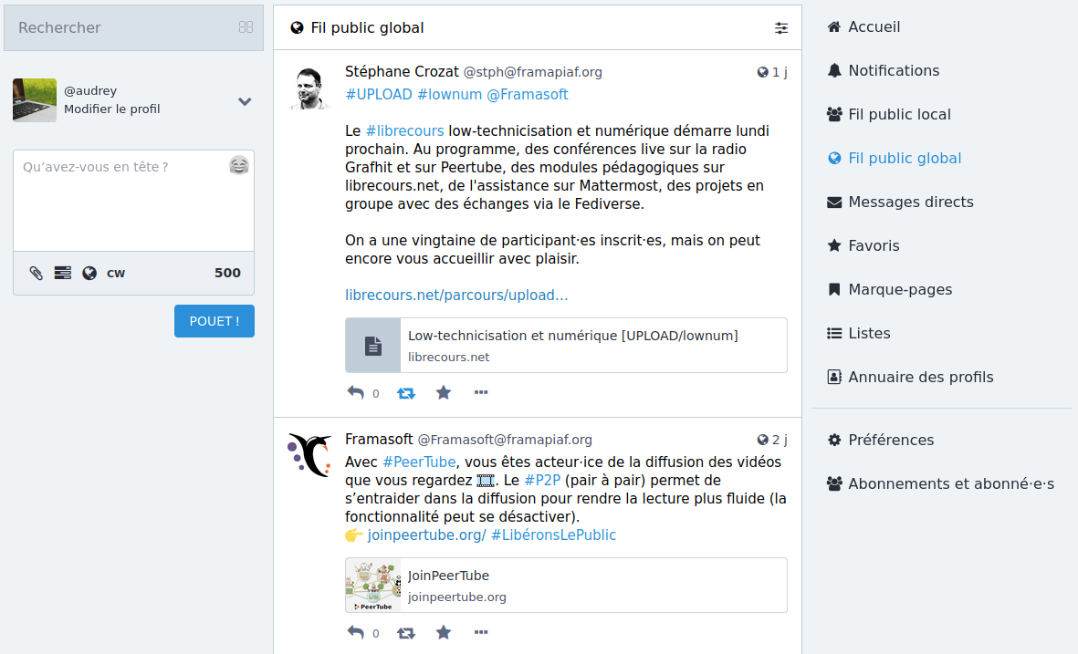Une colonne "Fil public local", où apparaissent tous les messages publiés par les comptes inscrits sur l'instance locale.