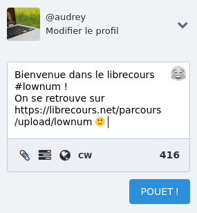 Il suffit d'écrire dans l'encart de la colonne personnelle, et de cliquer sur le bouton "Pouet !" (un pouet est l'équivalent du toot anglophone, choisi pour désigner un message sur Mastodon).