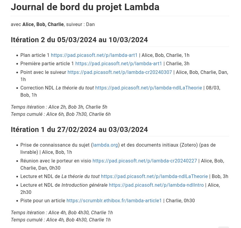 *Temps itération : Alice 2h, Bob 3h, Charlie 5h**Temps cumulé : Alice 6h, Bob 7h30, Charlie 6h*## Itération 1 du 27/02/2024 au 03/03/2024- Prise de connaissance du sujet (lambda.org) et des documents initiaux (Zotero) (pas de livrable) | Alice, Bob, 1h - Réunion avec le porteur en visio https://pad.picasoft.net/p/lambda-cr20240227 | Alice, Bob, Charlie, Dan, 0h30- Lecture et NDL de *La théorie du tout* https://pad.picasoft.net/p/lambda-ndlLaTheorie | Bob, 3h