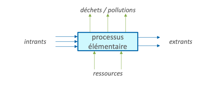 Un processus élémentaire est caractérisé à la fois par les flux qu'il échange au sein du système économique (intrants et extrants) et par ceux qu'il échange avec l'environnement (ressources naturelles et pollutions/déchets finaux, omis sur la figure ci-dessus).