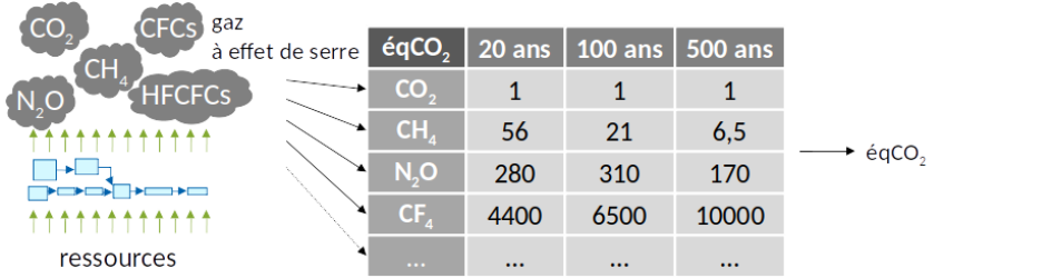 L'évaluation des impacts environnementaux consiste à produire, à partir des flux échangés avec l'environnement obtenus à l'étape précédente, des indicateurs environnementaux, qui diffèrent selon la méthode d'évaluation employée. Cette étape nécessite d'agréger des flux de natures différentes, par exemple pour exprimer le potentiel de réchauffement climatique de différents gaz en équivalent CO2 (cf figure ci-dessous). Ce principe est le même pour toutes les catégories d'impacts, ce qui explique par exemple que l'épuisement des métaux soit exprimé en équivalent fer (éq Fe) dans la figure 1 (bien que la norme soit plutôt l'équivalent antimoine, éq Sb).