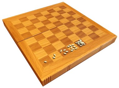 On doit placer 1 grain de riz sur la première case d'un échiquier, puis 2 sur la deuxième case, puis 4 sur la troisième, puis 8 sur la quatrième, et ainsi de suite en continuant de doubler à chaque case.
