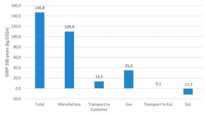 - Contribution au potentiel de réchauffement climatique (GWP: Global Warming Potential), exprimé en Kg éq CO2 à 100 ans, des différentes phases du cycle de vie d'un ordinateur portable Dell 7300 utilisé en Europe. Cette catégorie d'impact est directement liée aux aspects énergétiques, d'où l'importance de préciser la région d'usage car le mix énergétique n'est pas le même partout. On constate que la phase de production (Manufacture) prédomine. La fin de vie (EoL: End of Life) apparaît en négatif en raison de l'énergie récupérée lors de cette phase, par exemple par incinération des éléments plastiques.