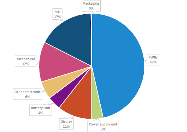 - Contribution des différents composants d'un ordinateur portable Dell 7300 au potentiel de réchauffement climatique. Les cartes électroniques (PWB, pour Printed Wiring Board) et le disque dur SSD sont responsables de la majorité des émissions de gaz à effet de serre.
