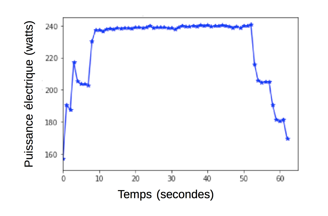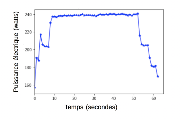 Ainsi on peut observer la consommation d'un équipement de type ordinateur de bureau lors du lancement d'une application intensive. La figure illustre ce profil énergétique de l'ordinateur en affichant la puissance électrique (watts) et le temps (secondes). On peut observer que cet ordinateur est en attente au début de l'expérience et utilise une puissance électrique de l'ordre 160 watts. Une fois démarrée l'application, sa consommation augmente pendant le temps de chargement et s'établit ensuite aux alentours de 240 watts.