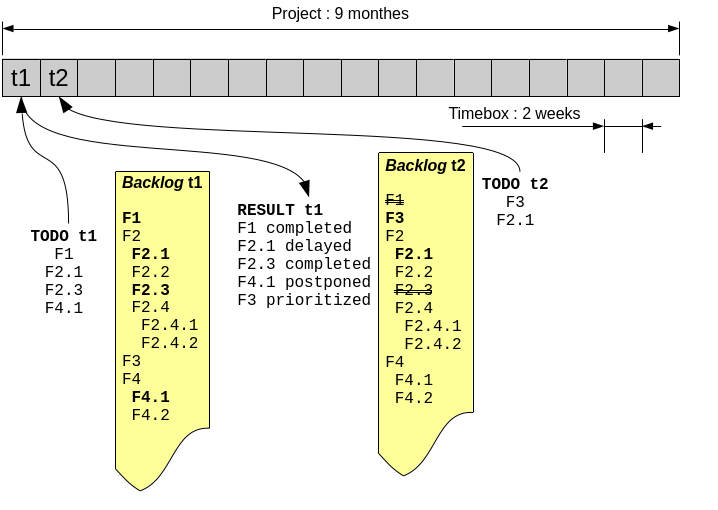 • Avant chaque timebox le product backlog sert d'outil d'arbitrage, il permet de commencer par le plus important, le moins coûteux, le plus urgent, le plus simple, ...